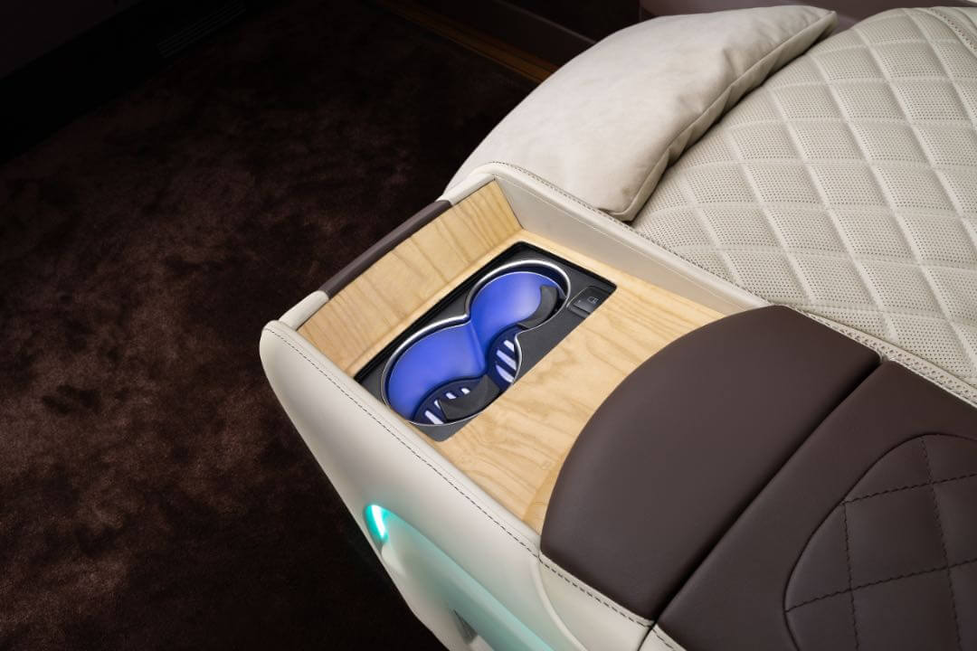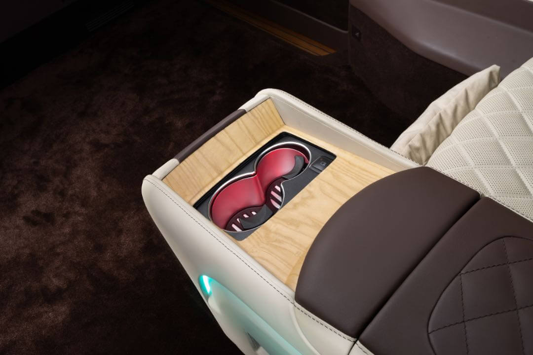 - Задняя консоль с подлокотником, выдвижной нишей для хранения личных вещей и подстаканниками с функциями нагрева и охлаждения